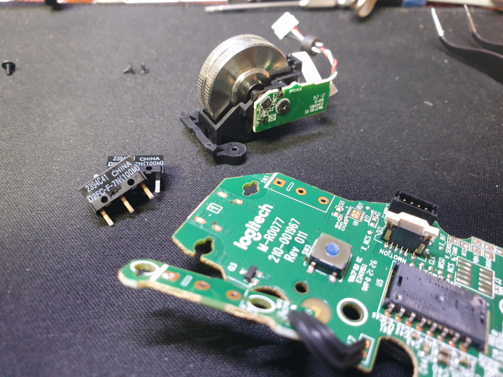 왼쪽 버튼 더블클릭증상인 버튼내 스위치불량으로 새 스위치 D2FC-F-7N(100M) 좌우교체 수리 진행합니다.