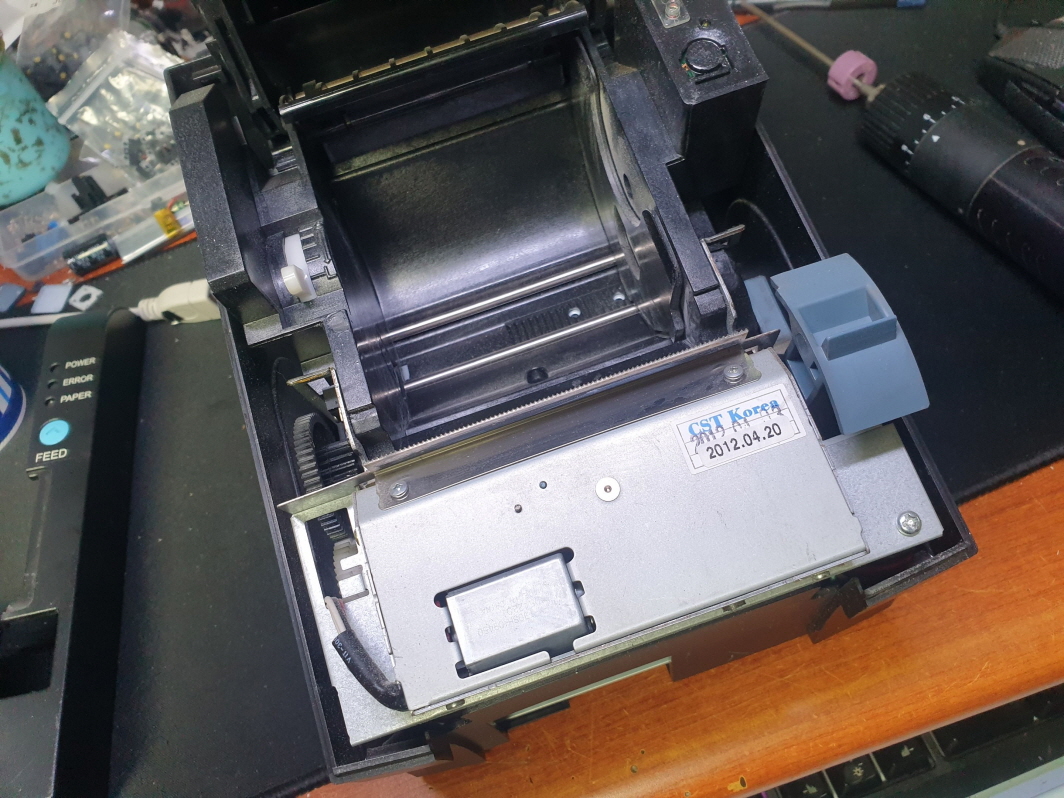 영수증 오토커터불량으로 인해 뚜껑이 열리지 않는 문제로 수리 진행합니다.