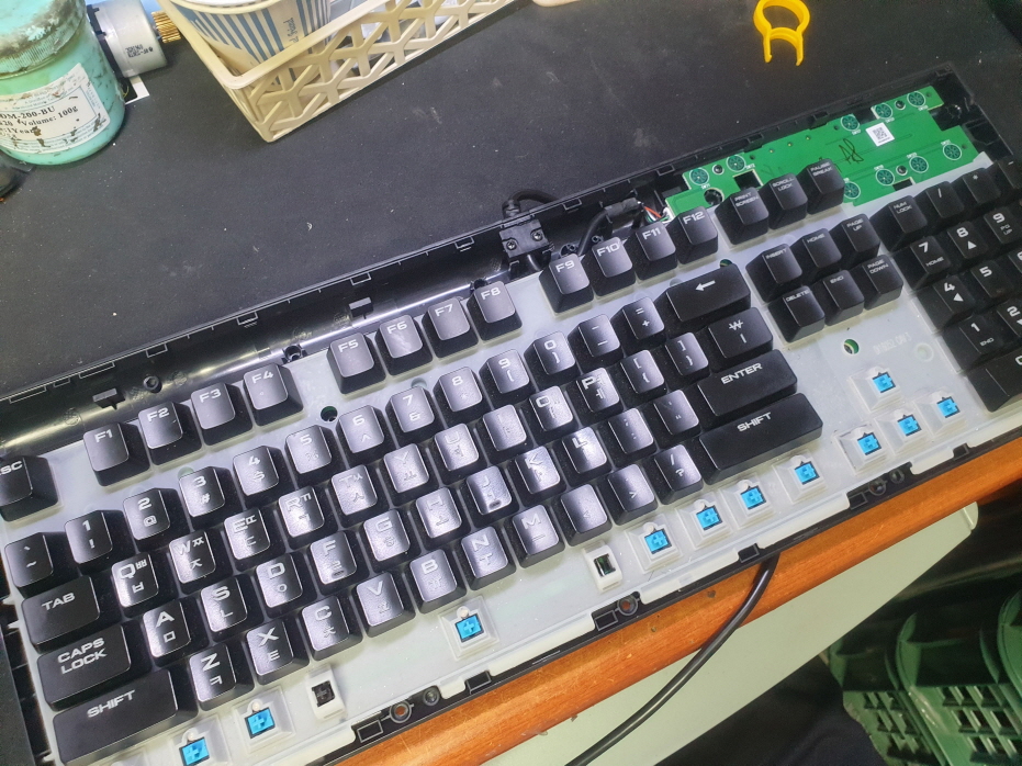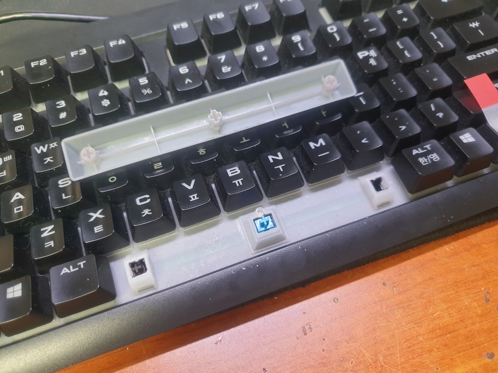단순 버튼내 스위치 불량으로 교체 수리 진행합니다. 추가로 스페이스바 스테빌라이져지지대파손으로 교체 수리 진행합니다. 사용중 키캡이 빠지는 경우 키캡상태가 불량하며 십자부분의 유격이 많아 생기는 문제입니다.
