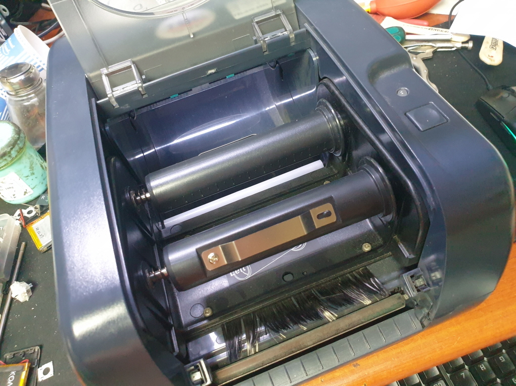 인쇄시 리본이 회전하지않아 리본(먹지)가 흘러내리는 문제로 수리 진행합니다.